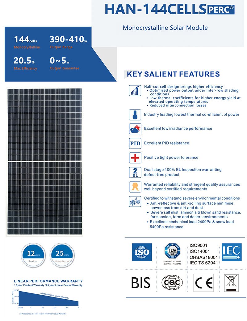 O meia célula PV módulos, são projetados racionais, excelentes no acabamento e têm um desempenho estável, a faixa de potência cobre 390W-410W, são amplamente utilizados em estações de energia fotovoltaica. produtos têm o vantagens de alta eficiência, alta potência, alta confiabilidade e longa vida.