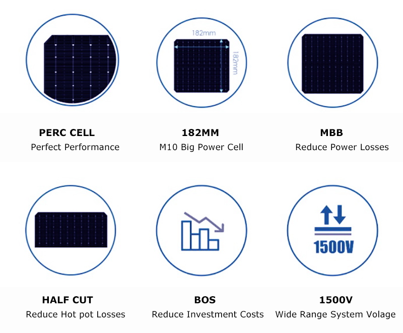PV módulos, são projetados racionais, excelentes no acabamento e têm um desempenho estável MBB painéis solares, coberturas de faixa de energia 530W-550W , são amplamente utilizados em centrais fotovoltaicas