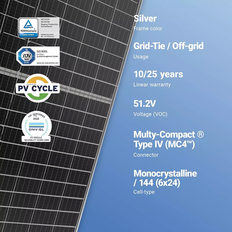 até 20% com uma potência máxima de saída de 410 W . Este painel tem maior tolerância à sombra devido aos conjuntos duplos e pode suportar altas temperaturas